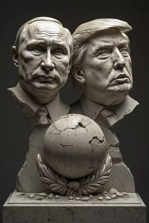 A sculptural representation showcases the stylized heads of Donald Trump and Vladimir Putin, each rendered in intricate detail. Vladimir Putin on the left presents a stern expression, characterized by distinct facial features including a prominent nose and furrowed brow, indicative of deep thought or contemplation. His hair is closely cropped, and he wears a formal suit with a tie that sits snugly against his collar.