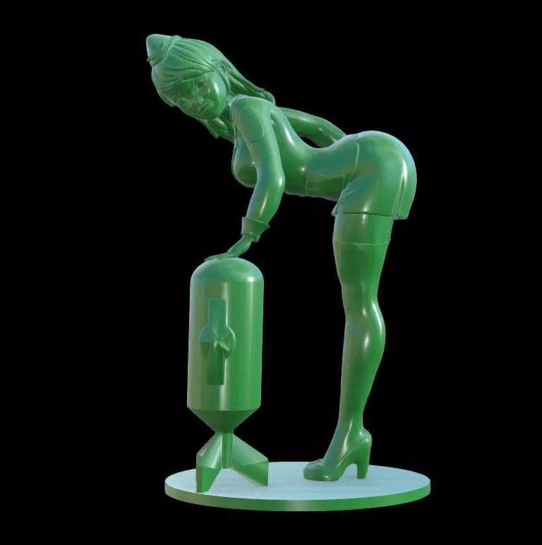 This 3D printable model depicts a beautiful and sexy pin-up girl in the classic style of World War II artwork. The figure stands in a playful, provocative pose, bending forward while holding a large bomb, reminiscent of the nose art often painted on military aircraft during the 1940s. She wears a tight-fitting, vintage military-style uniform complete with a hat, a deep neckline, and high heels, emphasizing her curves in an exaggerated and stylized manner. The model is mounted on a round base for stability during printing and display. This nostalgic piece captures the charm and boldness of wartime pin-up culture, ideal for collectors, hobbyists, or fans of retro aesthetics.