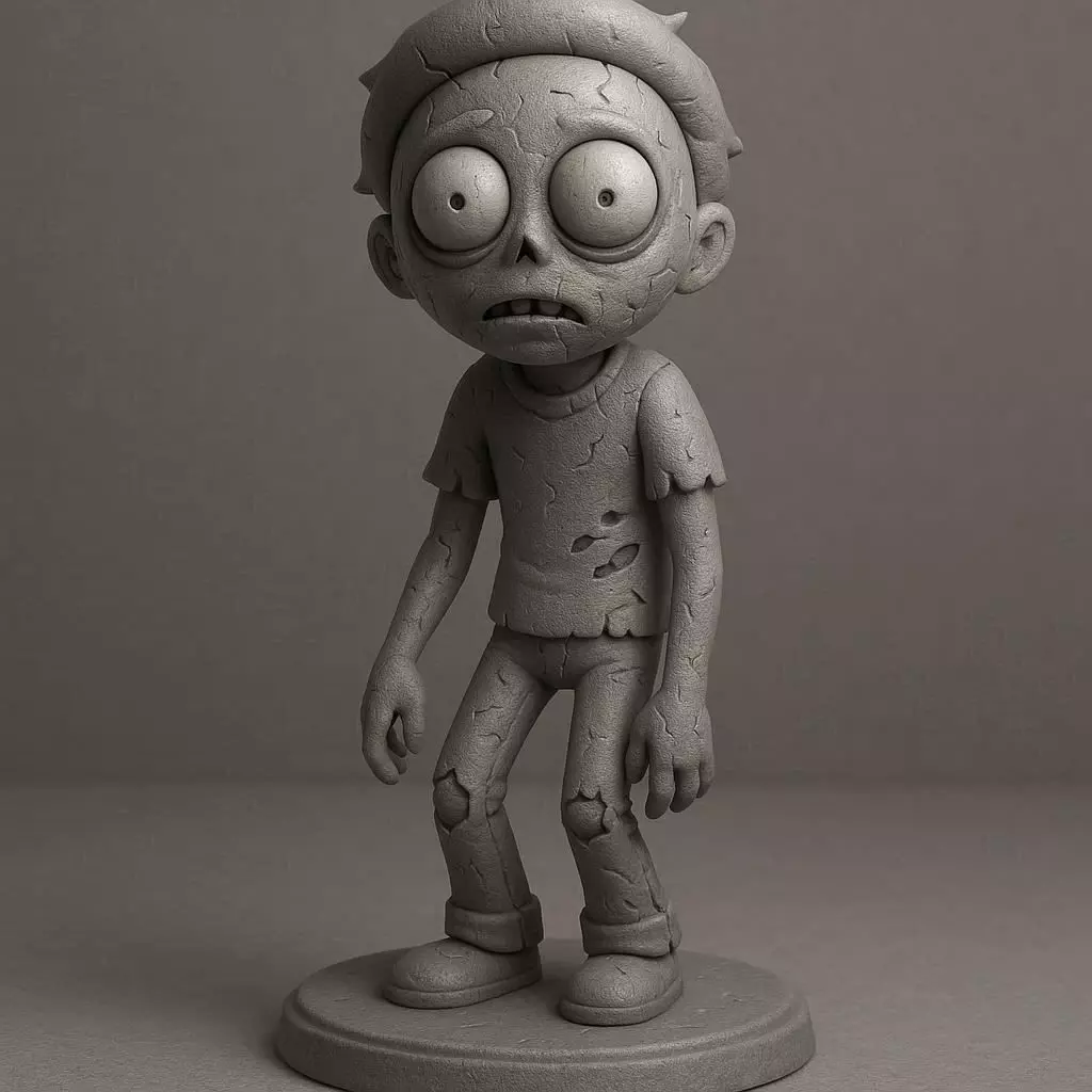 3D printable model of a stylized cartoon boy inspired by Morty from Rick and Morty, reimagined in a spooky, undead theme. The figure stands on a round display base with a slightly slouched pose and an eerie, wide-eyed expression. His short hair is slightly messy, and his T-shirt and jeans appear worn and torn with simplified stylized detail. Subtle cracks and dents suggest an undead look while maintaining a playful, cartoonish tone. Smooth, reinforced geometry optimized for reliable 3D printing, with strong connections between figure and base for durability. Compact and sturdy design, ideal for Halloween decoration or collectible display. Neutral studio lighting, white background.