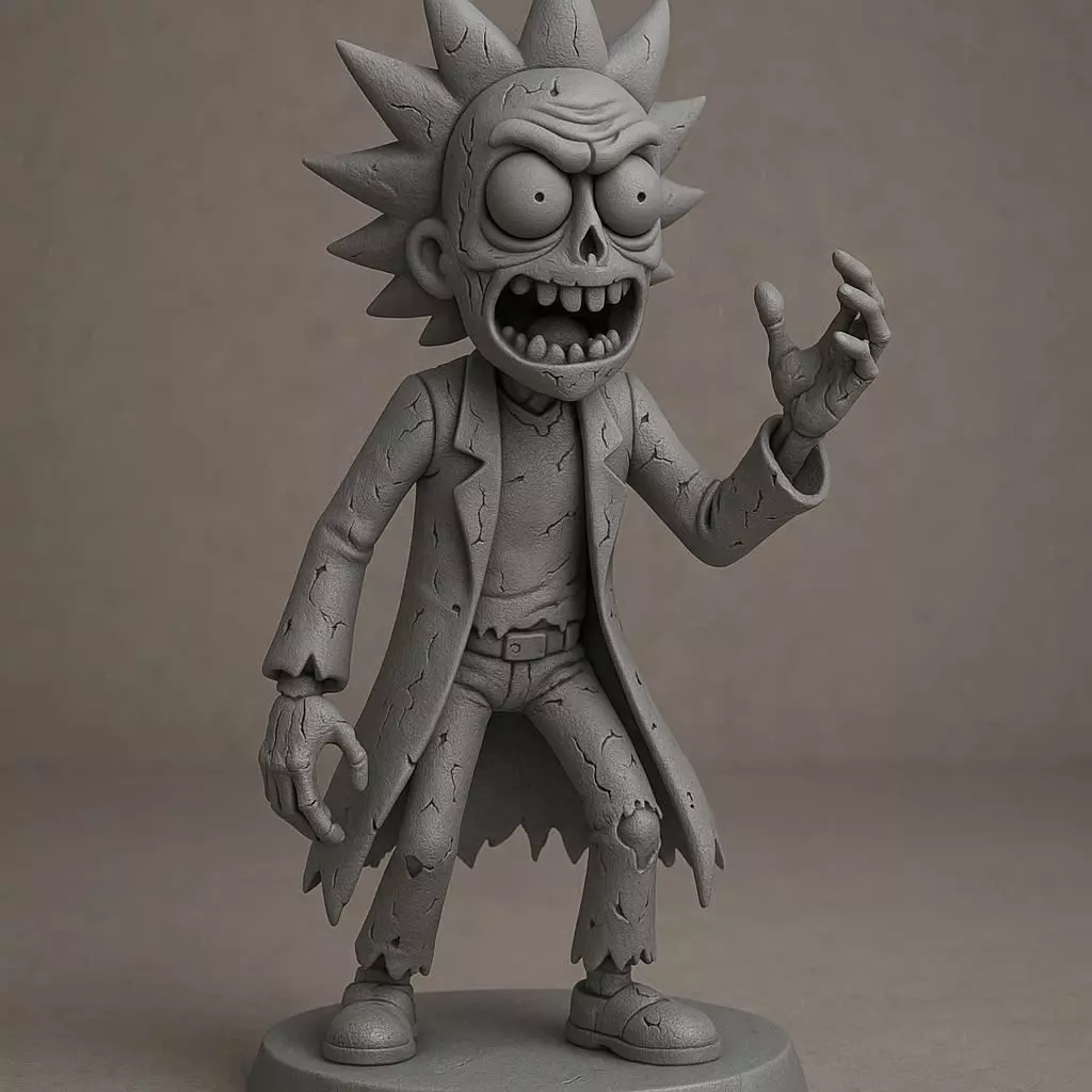 3D printable model of a stylized cartoon scientist inspired by Rick from Rick and Morty, reimagined in a spooky, undead theme. The figure stands on a sturdy round display base with his signature spiky hair, unibrow, and wild expression. His lab coat and clothes are slightly tattered, featuring light surface cracks and dents to suggest an eerie, worn look while preserving a playful, cartoonish style. One hand is raised as if gesturing mid-rant or holding an unseen gadget, adding a sense of motion and personality. Smooth, reinforced geometry optimized for reliable 3D printing, with strong connections between figure and base for durability. Compact and sturdy design, perfect for Halloween decoration or collectible display. Neutral studio lighting, white background.