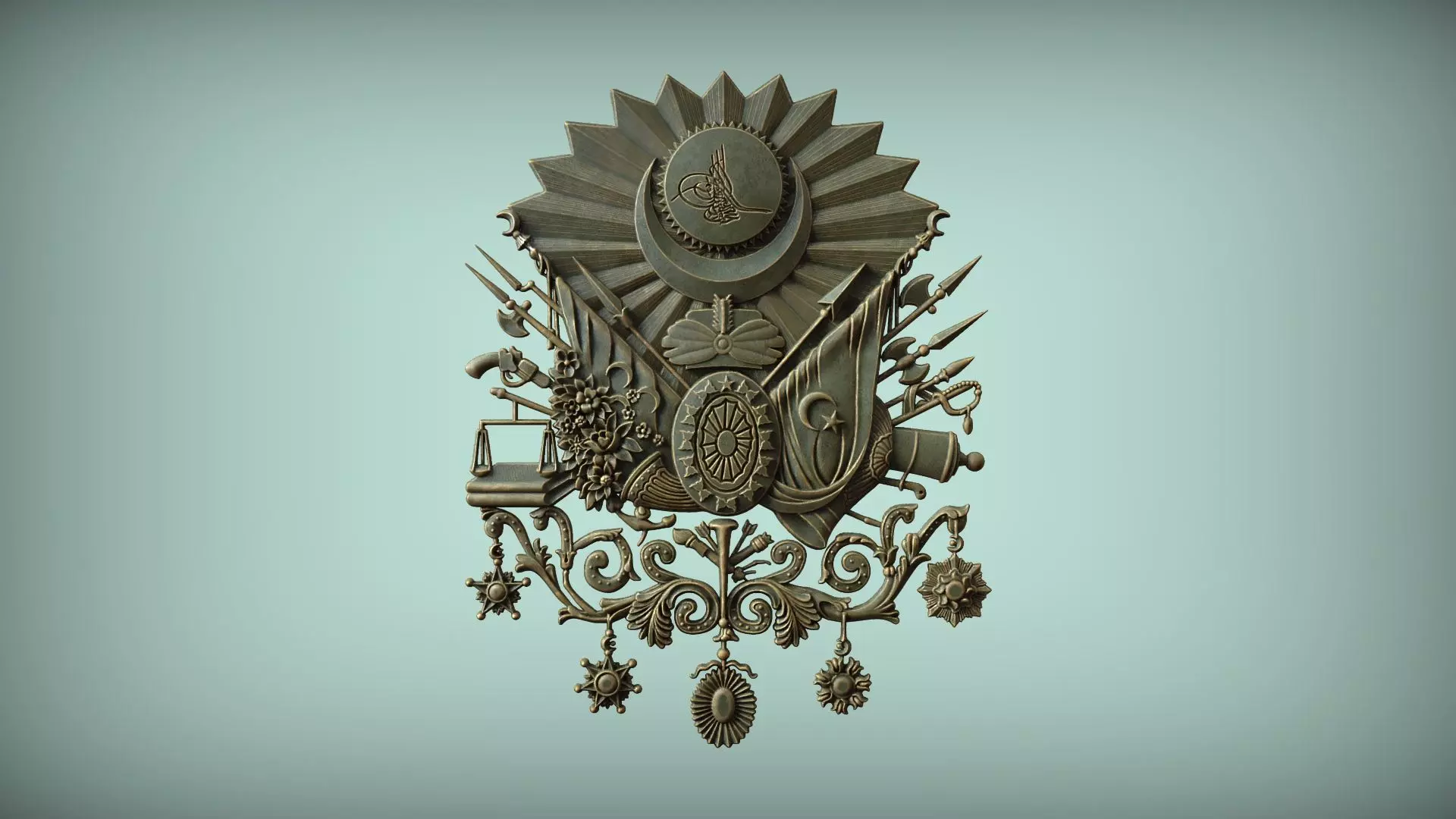 File format: STL (optimized for CNC and 3D print workflows)Model type: Detailed high-relief emblem of the Ottoman coat of arms, with historically accurate symbols representing justice, military strength, legal and cultural facets of the empire.