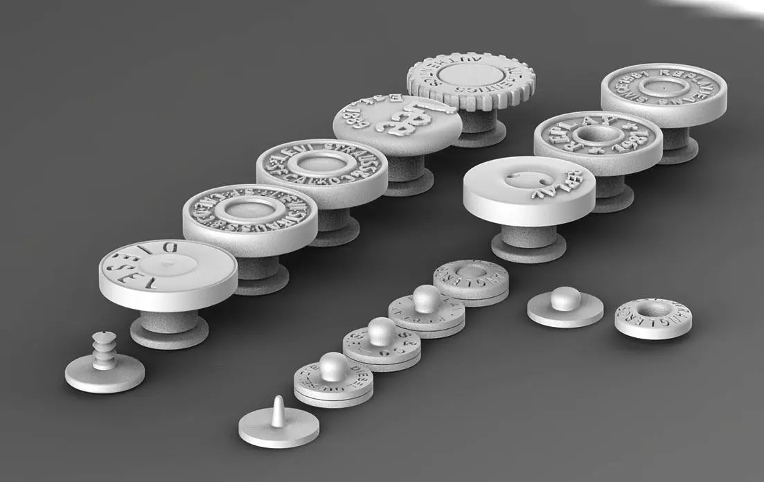 This is a detailed 3D model set of jeans rivets and metal buttons, inspired by classic denim and workwear hardware.