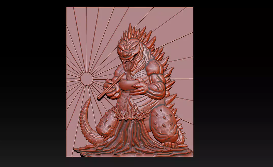 Add a unique, powerful, and fun touch to your collection with this high-quality Kaiju Dragon Relief 3D model. This digital sculpture depicts a legendary dragon (Godzilla-inspired) enjoying a bowl of ramen over a volcanic landscape with a rising sun background. It’s a perfect mix of Japanese pop culture and traditional relief art.