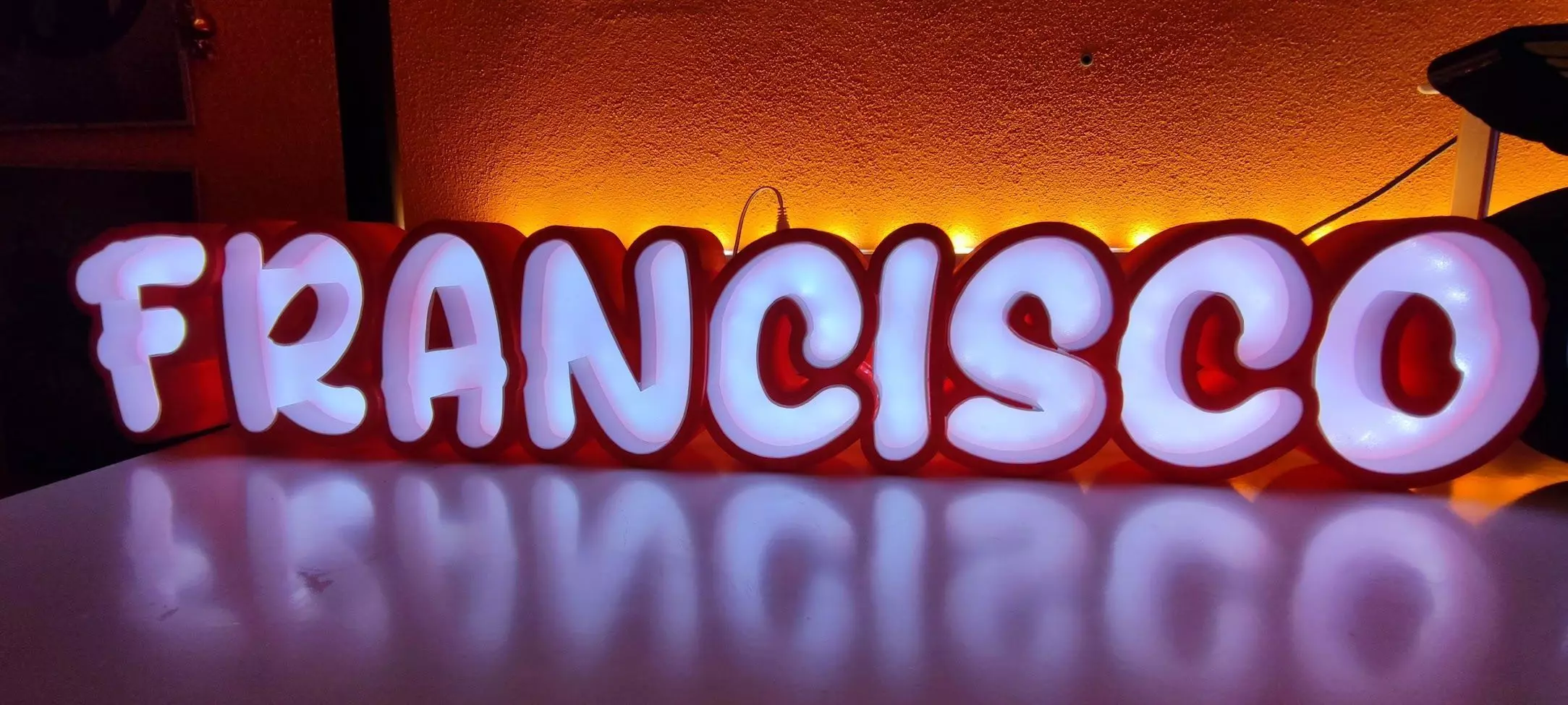 -------------- ENG ----------Nameled of the name Francisco. The letters are about 115mm height. Printed with PLA, nozzle 0.4mm , 5% inflill and 0.2 resolution. Works fine also with 0.6 nozzle and 0.3mm resolution. For my experience 5% infill is enough.Also included f3d file to modify holes acording to your led power preferences. -------------- PT ----------Nameled do nome de Francisco. As letras têm cerca de 115 mm de altura.Impresso PLA, nozzle de 0,4 mm, inflill de 5% e resolução de 0,2. Funciona bem também com nozzle de 0,6 e resolução de 0,3 mm. Pela minha experiência, 5% de preenchimento é o suficiente.Também incluído arquivo f3d para modificar orifícios de acordo com suas preferências de alimentação do led.
