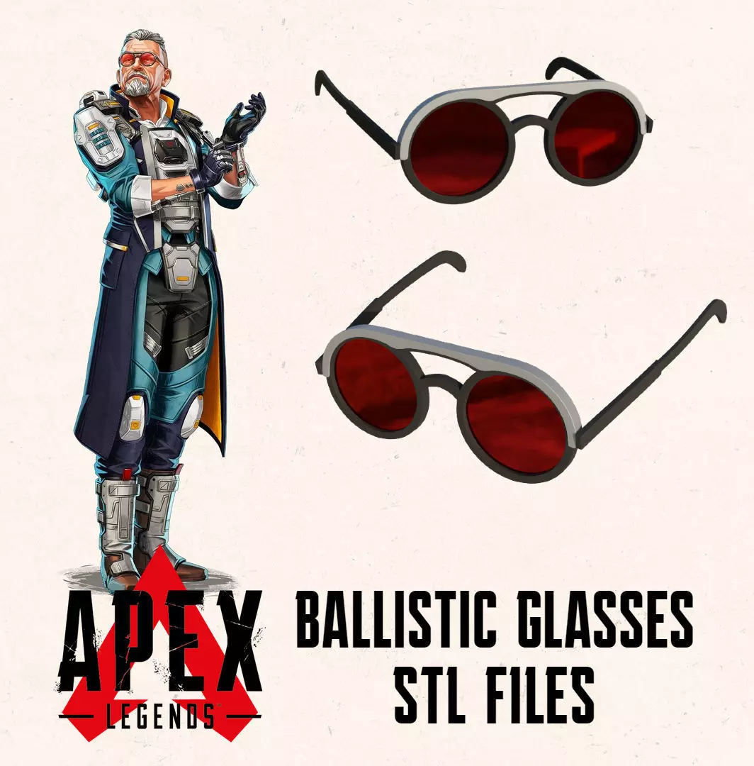 Ready to print Ballistic's SunGlasses from Apex Legneds Teaser. SLA print reccomended. Have a few options. 1.5mm glass can be printed or you can use 0.2mm clear plastic. Or you can print just the frame without glasses.
