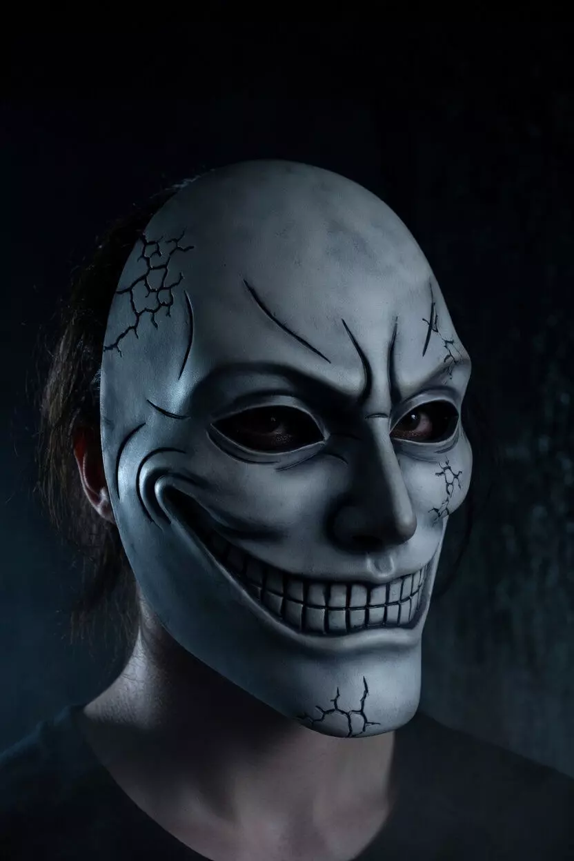 Deep cracked porcelain-like fractures across the entire faceWide maniacal grin with detailed sharp teeth and creepy expressionRealistic horror details perfect for scaring friends or creating nightmare content