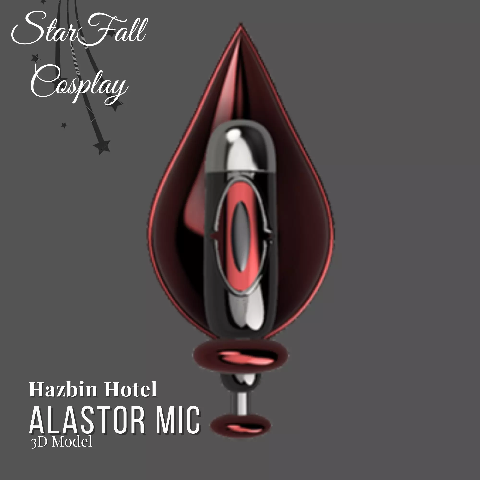 Included in your download is a zip file containing the Eye Iris, Eye Pupil, Mic Body, Mic Top(Smooth/Holes), Mic Wrap, Staff Base, and Staff Bottom. The Item prints on most printers without any cutting, and the mic body is ~15 inches tall. The mix pieces slot together with pre-designed notches and have room at the base for a 1-inch dowel as the handle.