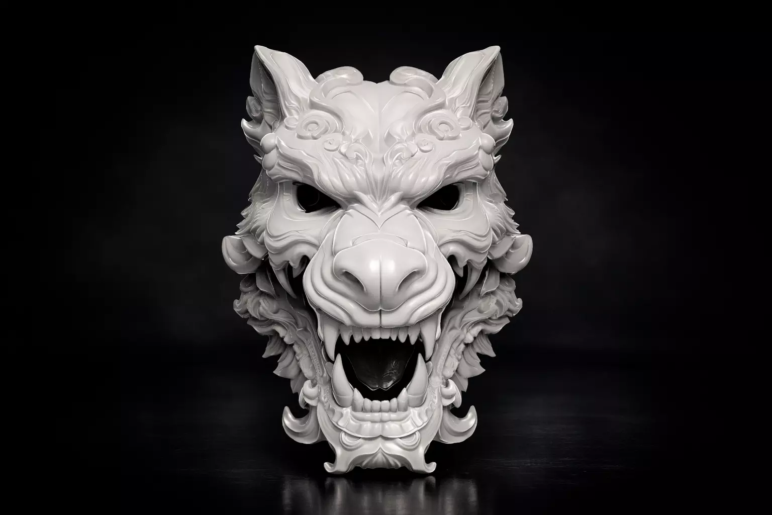 Celebrate the power, luck, and renewal of Chinese New Year with this striking 3D printed Wolf Dragon mask sculpture. Inspired by traditional East Asian guardian motifs and modern digital artistry, this piece blends fierce expression with elegant flowing details. The sculpted face features bold lines, sharp fangs, and layered ornamental textures that symbolize protection, prosperity, and courage—perfect themes for Lunar New Year celebrations.