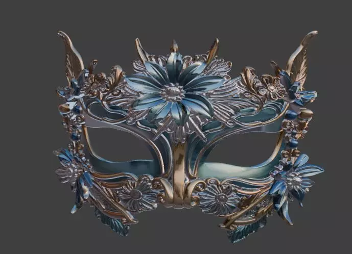 An intricately designed fantasy masquerade mask featuring a blend of steampunk elements, metallic filigree, and ornate floral structures. The mask displays a luxurious color palette of teal, gold, and deep blue, adorned with sculpted petals, leaves, gems, and elegant curves. Ideal for cosplay, décor, collectible display, or high detail resin 3D printing.