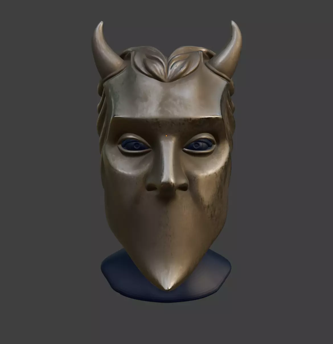 Featuring a smooth, reflective surface with stylized facial contours, prominent horns, and hollowed eyes, this mask is both haunting and regal — perfect for stage presence, cosplay, or collectors.