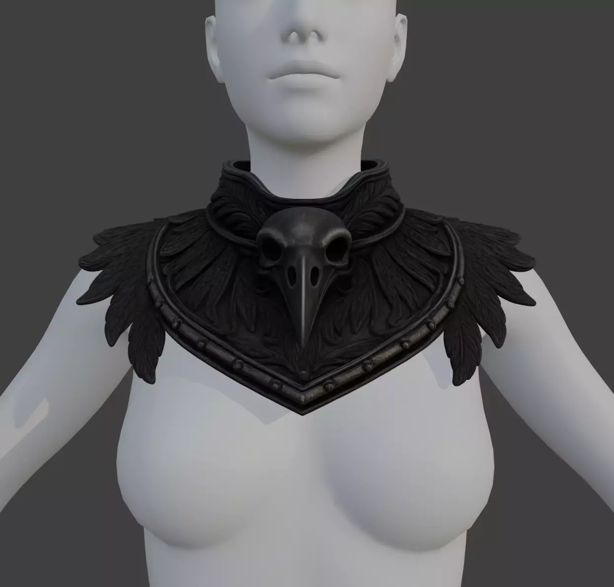 An ornate and dramatic neckpiece inspired by gothic fashion and the haunting elegance of crows. Designed with layered feather textures, sharp edging, and a high, structured collar silhouette, this gorget adds intensity and mystique to any dark fantasy or vampire cosplay.