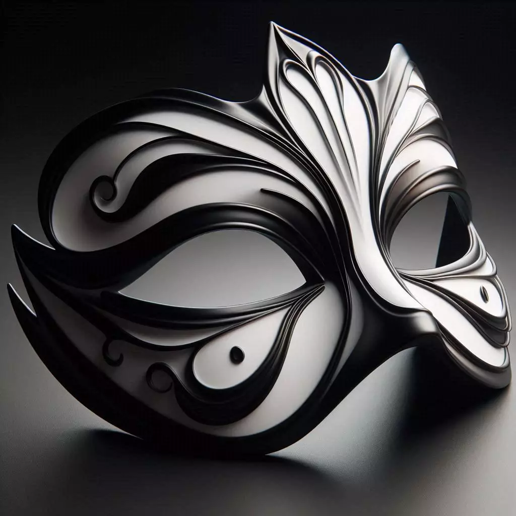 A refined Venetian-style masquerade mask designed with flowing, organic curves and striking black-and-white contrast. The sculpted form features swirling patterns around the eyes and an elaborate feather-like crown that enhances its dramatic presence. Smooth contours and polished surfaces give the mask a sleek, dimensional appearance when printed.