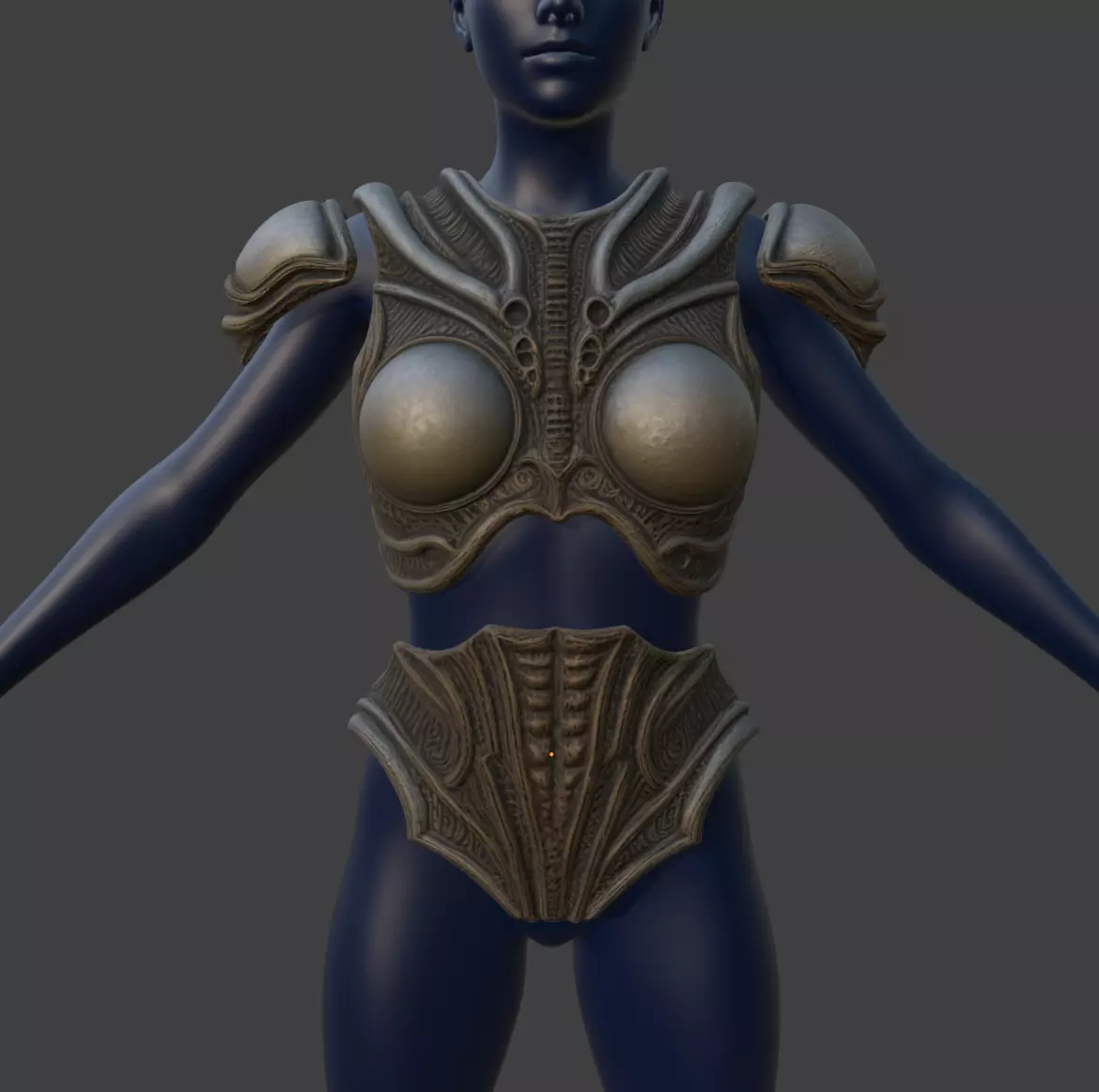 This sci-fi armor set is designed with a smooth, biomechanical style inspired by xenomorph aesthetics. It includes a chestplate, segmented belly armor, and sleek curved pauldrons that together create an aggressive, alien-futuristic silhouette. Ideal for cosplay, collectibles, or stylized action figures.