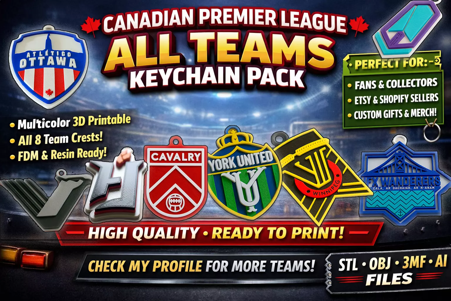 • Canadian Premier League Teams Keychains Color printable and renderable • Multicolor 3D printable & render-ready• High-quality pack with all team crests• Optimized for multicolor 3D printing and rendering.• Perfect for keychains, fan merch, and collectible sets.