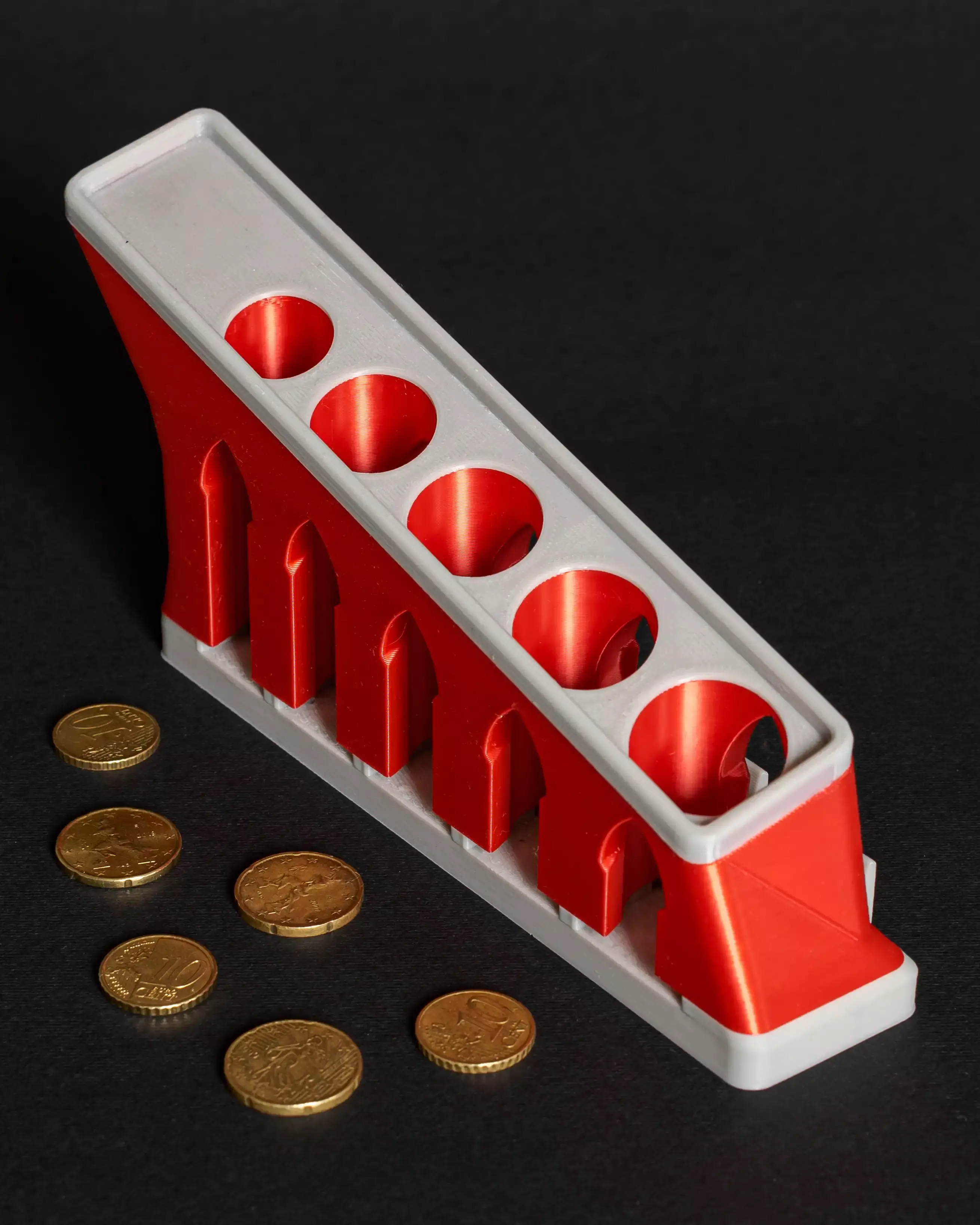 3d printed desk euro cent coin organizer. The structure of the coin organizer has minimal and clean shapes. It is equipped with levers which, once pressed, allow the coins to come out. Furthermore, by inserting springs such as those of pens, it is possible to make the levers go back. The coin organizer is divided into four parts that can be assembled together by means of joints: base, body, slide and levers. It can store coins of 10 cents, 20 cents, 50 cents, 1 euro, 2 euro.