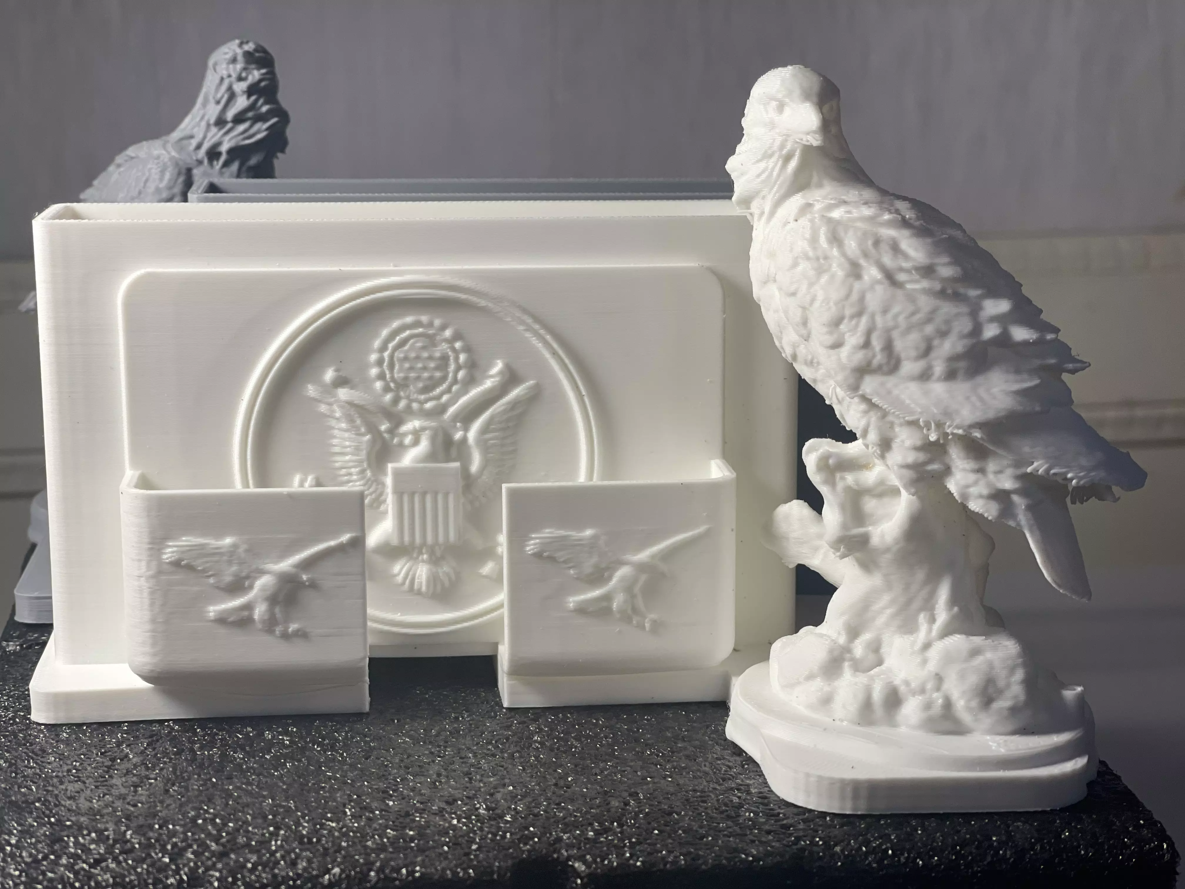 Keep your cell phone and note pad safe and organized with this patriotic bald eagle holder. The intricate design features the iconic symbol of the United States and can easily hold your device. The holder is perfect for those who love to accessorize their phone with unique mounts and holders. Crafted with attention to detail, this holder is durable and sturdy. It is perfect for those who need a reliable phone holder for work or home. The bald eagle design is eye-catching and unique, making it a great addition to any collection. Get this phone holder today and show off your patriotic side!