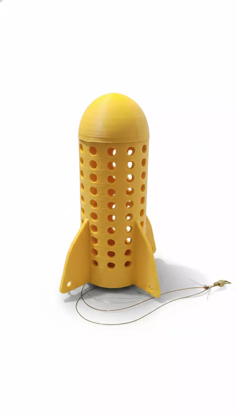 Carp rocket feeder: the head is glued to the body. It comes with guide fits to make gluing easier. Four threads or fishing lines are tied to the eyelets and joined at a single point, which is then tied to the main line of the rod. The bait used to feed is placed inside (it should not be small enough to fall out through the holes) and throw the rocket into the water. Because the head contains air, the feeder sinks and the top automatically tries to float, orienting the opening (through which the bait falls) downward. The image can show the optimal way to tie it, I recommend using thick thread or heavy fishing line/nylon to prevent cutting.