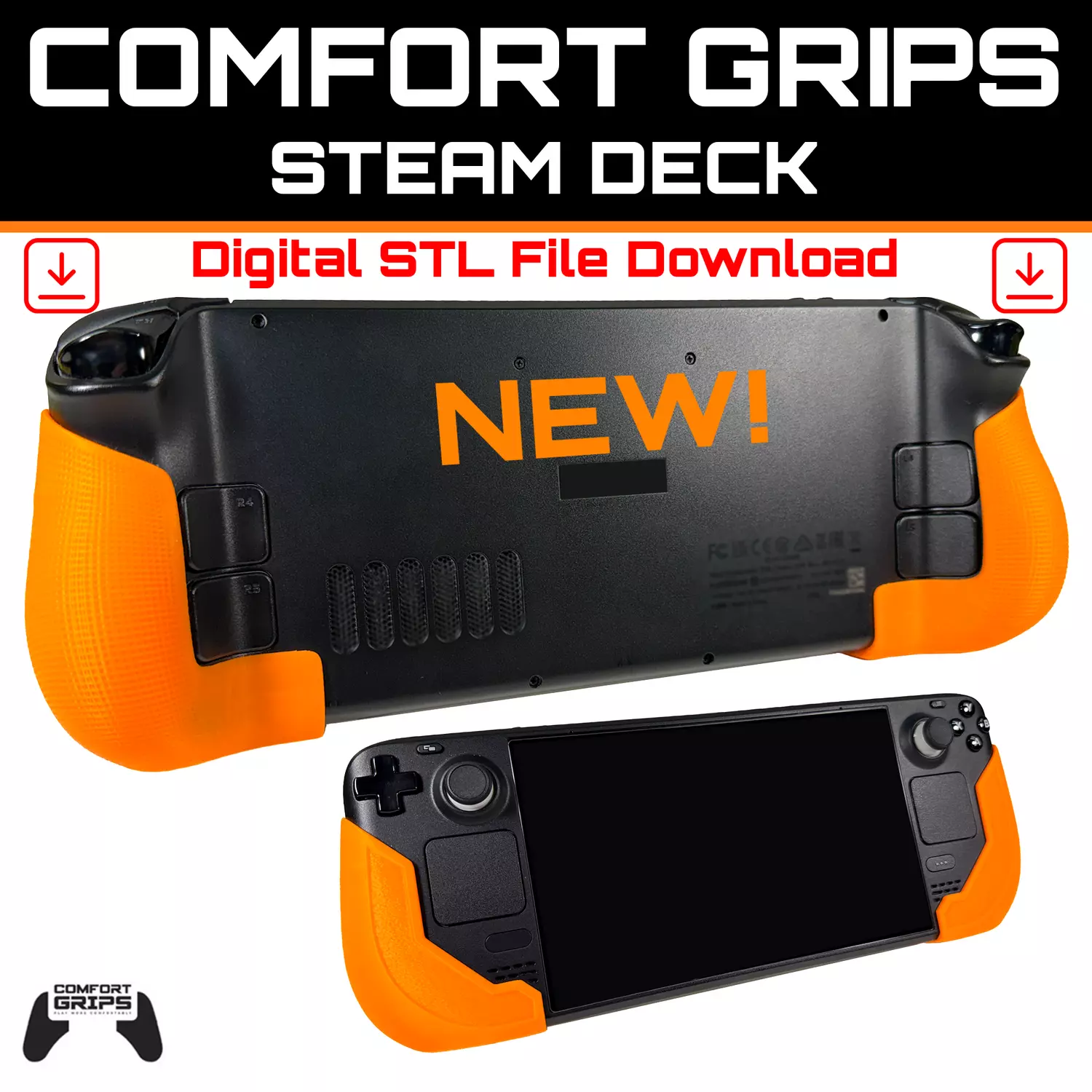 Make your Steam Deck much more comfortable with our high quality comfort grip STL files! Eliminate hand cramps and fatigue with ultra ergonomic grip handles. Once printed, these grips can help drastically extend play time and improve enjoyment of the Steam Deck device! Easy on, Easy off, These grips can be installed and removed quickly and simply!(This is an unofficial 3rd party STL files designed by Comfort Grips. We are not affiliated with Steam or Valve in any way)