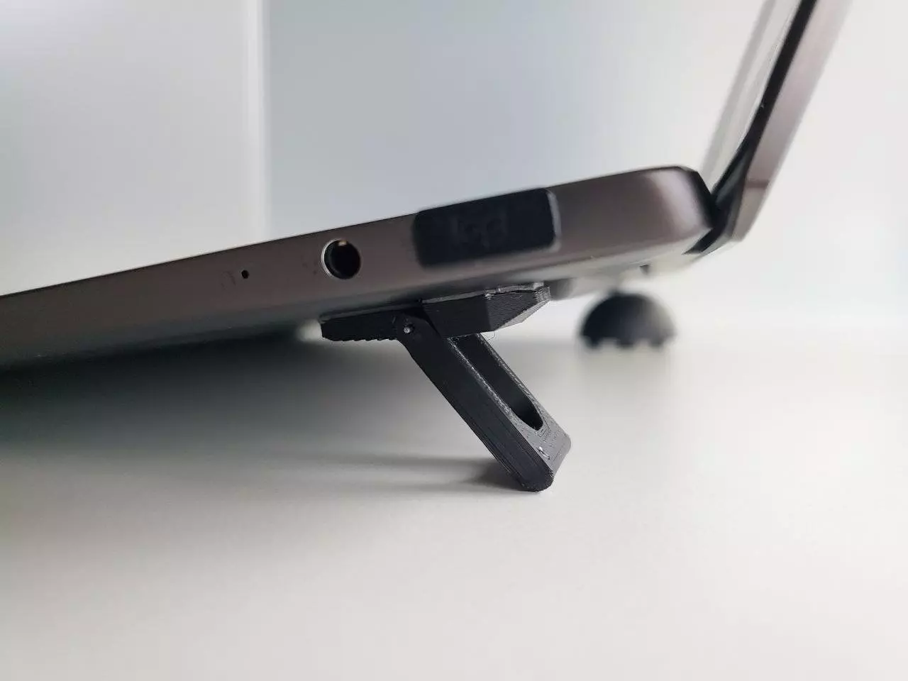 Minimalistic and easy to print folding feet for laptop rear side elevation and better air flow.I designed them for my Lenovo ultrabook 720s which is very thin, powerful, but super hot when processor is moderately loaded. Feet are 5mm thick when folded, which is 1mm taller than stock rear elevated pad. When unfolded the rising is 30mm - good enough for much better ventilation.