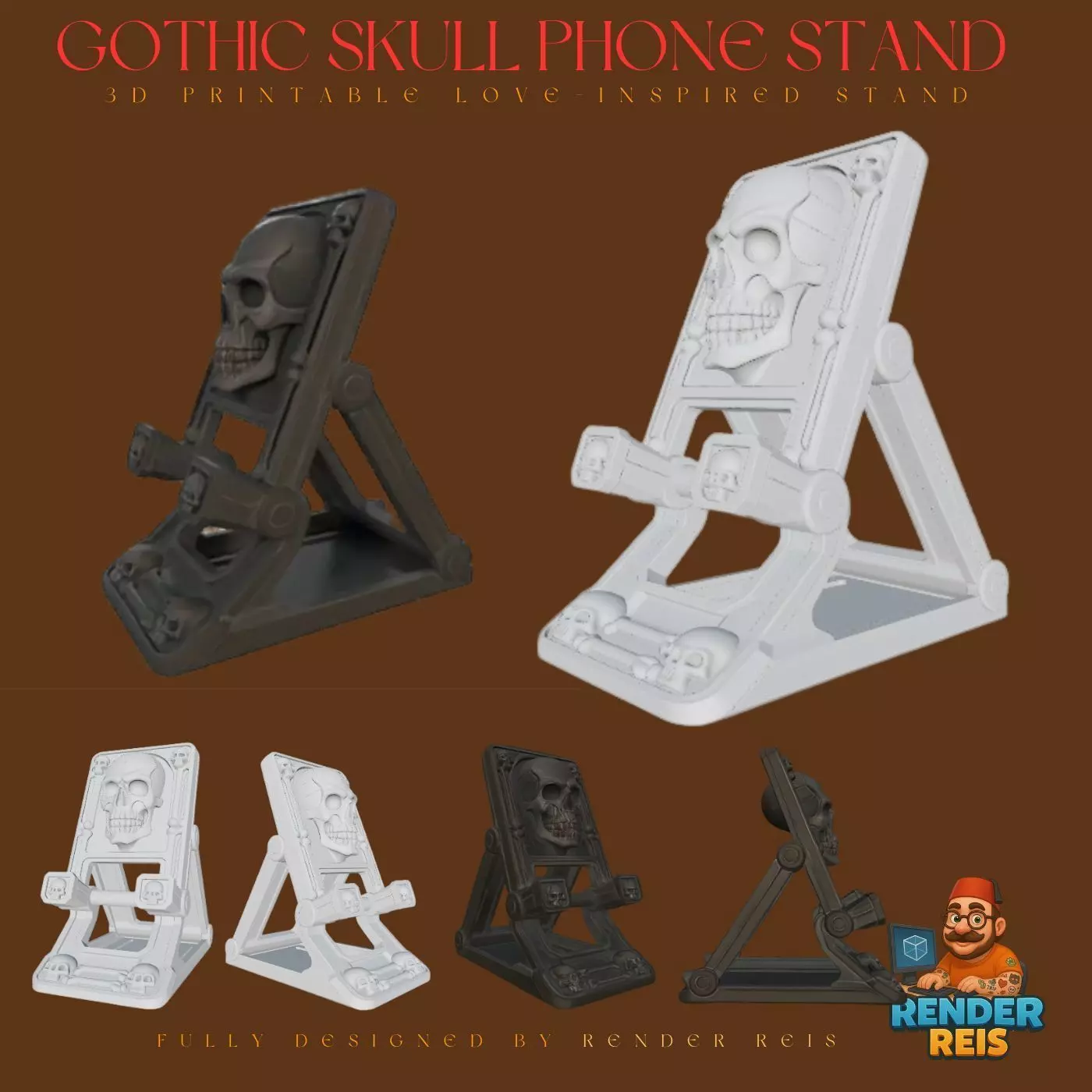 Unleash your dark aesthetic with this foldable gothic skull phone stand, combining functionality and macabre artistry. Designed for support-free 3D printing using PLA on FDM printers, this stand features snap-fit hinge joints and works in both vertical and horizontal orientations for most smartphones.