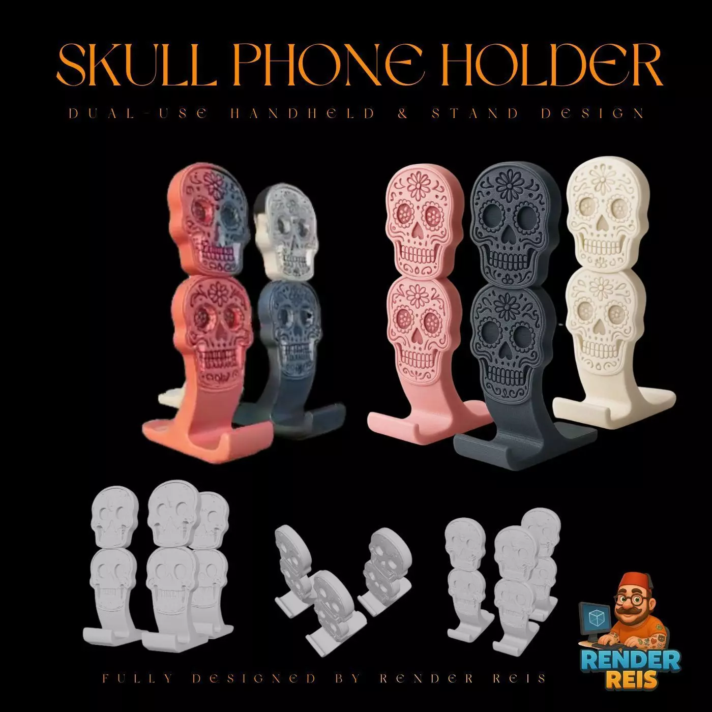 This uniquely designed 3D printable skull phone holder combines gothic flair with everyday functionality. Shaped like a realistic human skull, this model securely holds your smartphone and can be used either as a handheld grip or a stable desk stand. Its clever ergonomic shape ensures comfort in the hand, while the angled design supports visibility when placed on a flat surface.