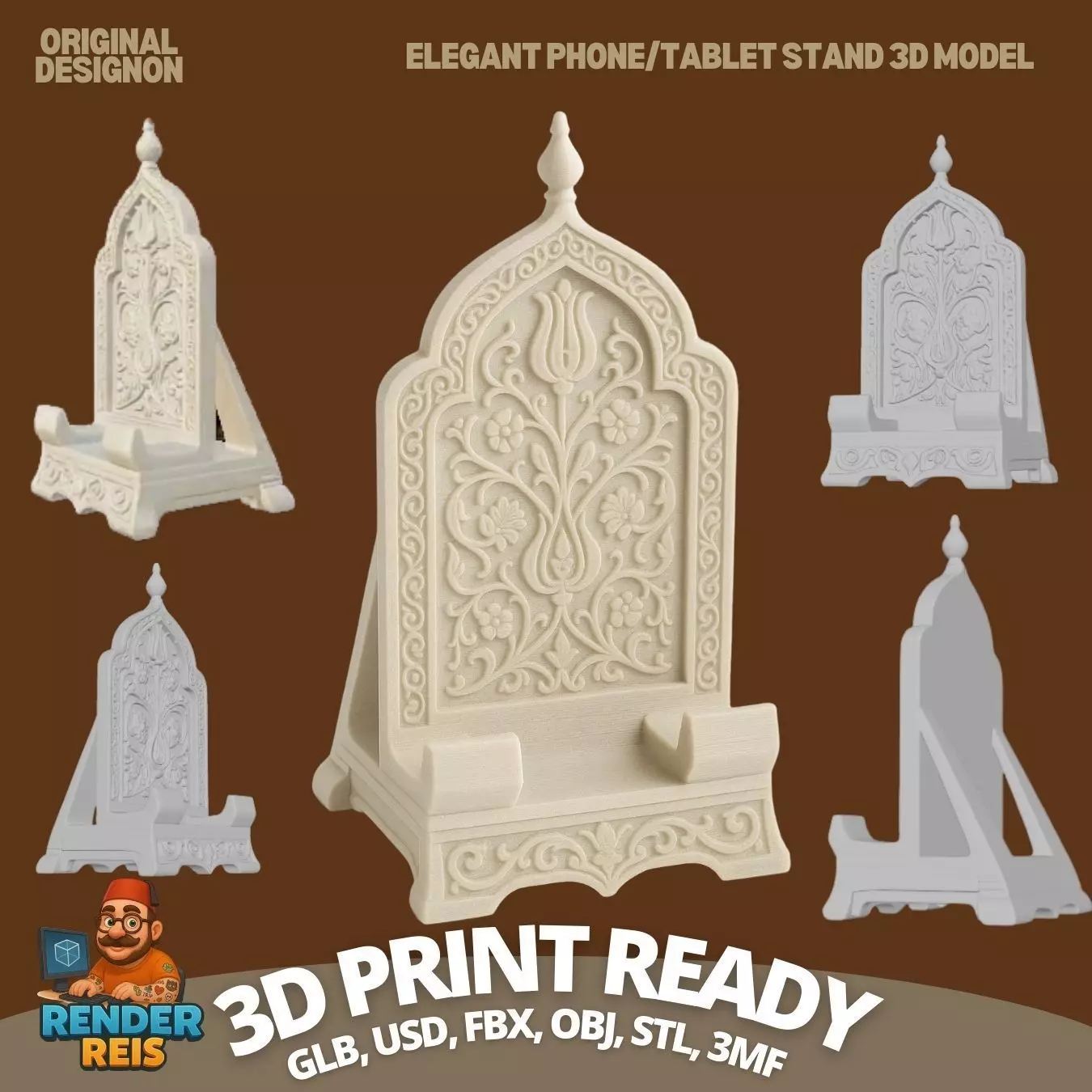 Seljuk Style Phone/Tablet Stand 3D ModelDescriptionThis elegant 3D model is more than just a stand for your phone or tablet—it’s a celebration of Eastern architectural artistry. Inspired by Ottoman and Seljuk design, the model features an arched top frame, intricate geometric surface patterns, and stylized floral motifs that bring a sense of historic richness to modern devices.Whether placed on a desk as a functional accessory or used as a standalone decorative object, this stand offers both aesthetic charm and practical use. It supports both horizontal and vertical placement with a precise viewing angle for comfort. Thanks to its 3D-printable format, you can bring this cultural artwork to life with your own hands and creativity.