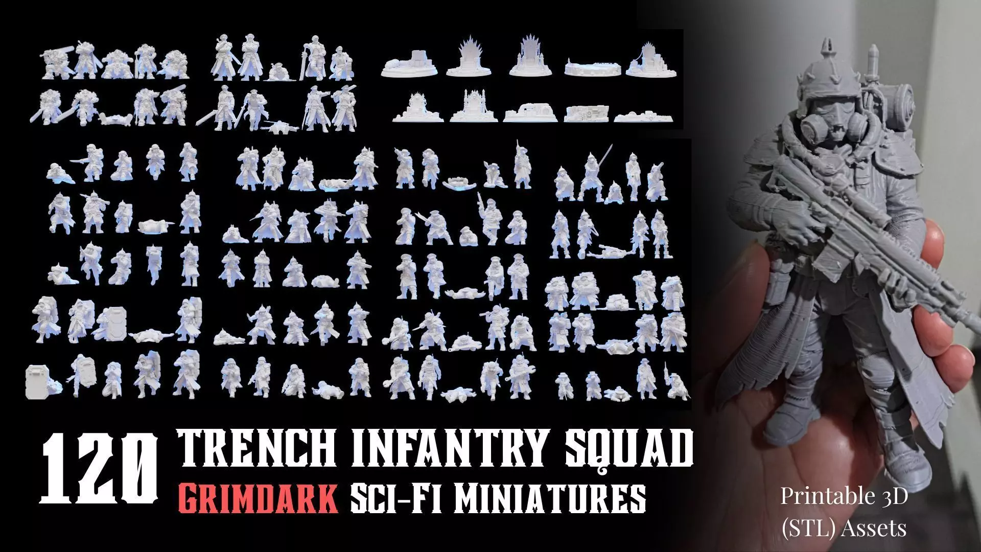 120 Printable 3D Miniatures – Grimdark Sci-Fi Miniatures - TRENCH INFANTRY SQUADDigital Product | STL Files + Blender Files for 3D Printing & CustomizationBring your tabletop battles to life with 120 detailed 3D miniatures, perfect for DND, Pathfinder, Warhammer, or other fantasy campaigns.Whether you're a player, dungeon master, or collector, this pack gives your world more character and depth.