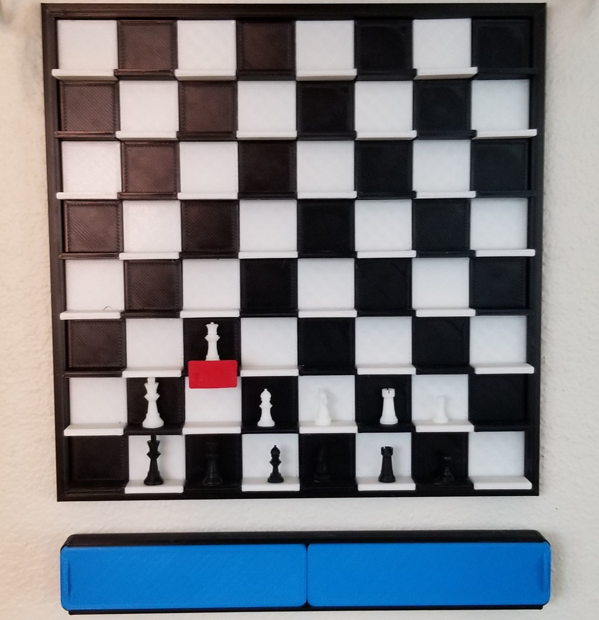 The design is of a wall-mounted chess set with a 12x12 play area, with an overall size of the one-piece chessboard and frame is 12.7 x 12.7. As a result, a 3D printer with a 330x330 mm print bed is required. The chessboard, backplate, frame, and 32 black squares with small shelves are all one printed piece. The 32 white squares/shelves are each printed separately and glued in place using gel-type instant adhesive (super glue gel).