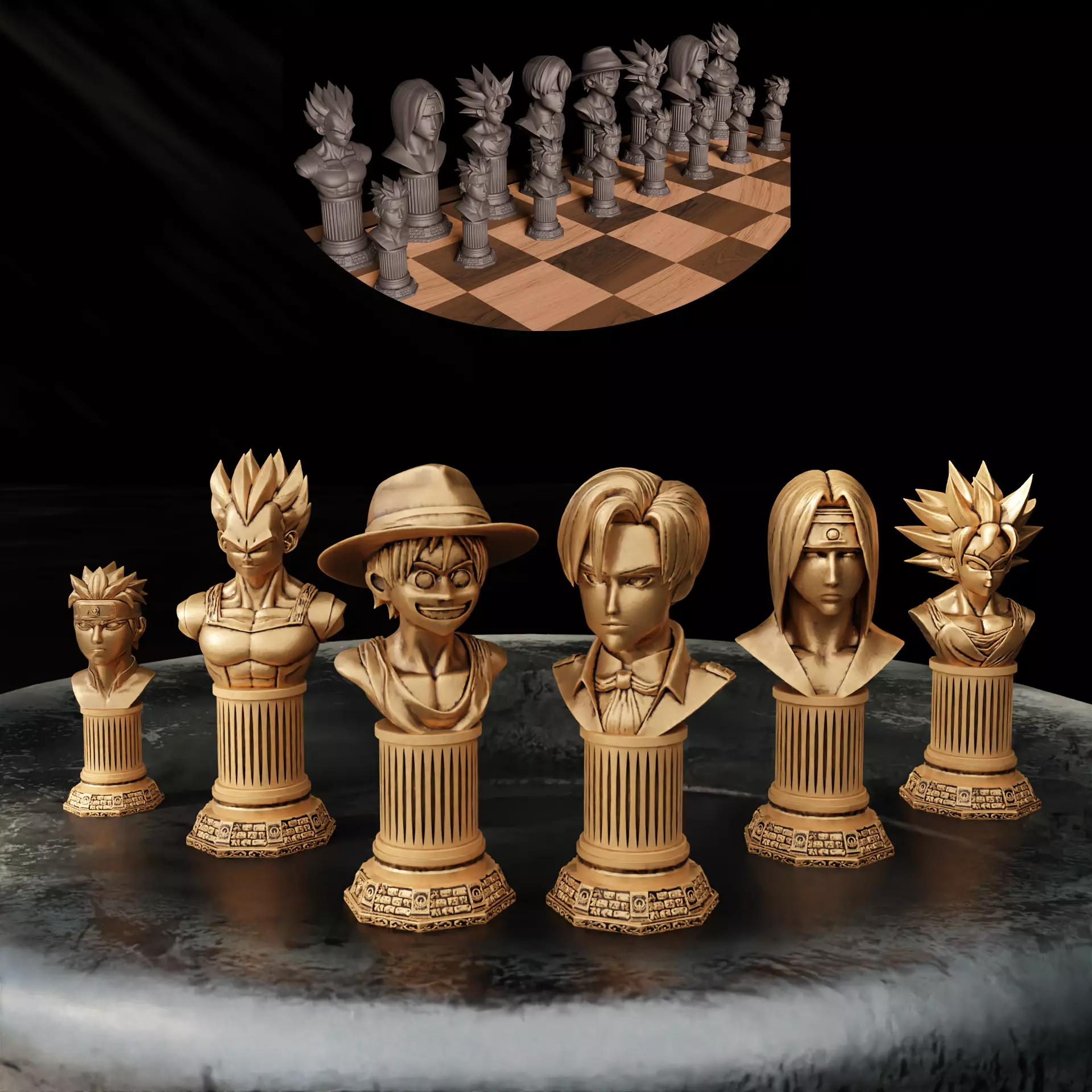Epic crossover of anime worlds! This premium set features 6 highly detailed busts of legendary anime characters (Goku, Vegeta, Luffy, Trunks, Android 18-inspired, and more) on ornate rune pedestals – perfect for ultimate fan chess sets or display.