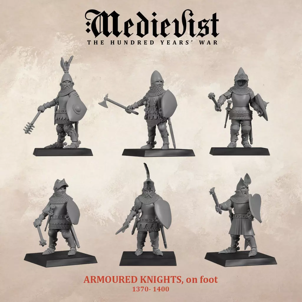 This set includes six armored knight miniatures, depicted on foot, designed for historical wargaming. The models are based on European armor in use between 1370 and 1400, a period marked by a transition from reinforced mail armor to the first forms of full plate armor. Each miniature is highly detailed and faithful to the sources of the period. The set includes numerous customization options, allowing the knights to be equipped with a wide variety of weapons (swords, axes, maces), several types of shields, and plumes for added variation.