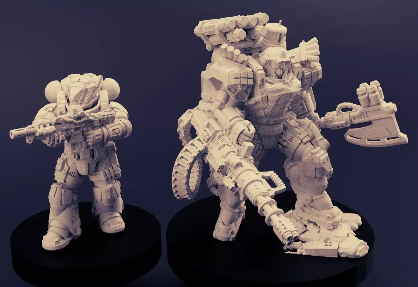 Heavy infantry for 3D print, approximately 60-70mm tall. Comes with 3 barrel gatling gun, sniper rifle, shoulder rockets, empty hand and axe hand. Please check back regularly as I will continuously update with improved files and options. Includes STLs of seperate components as indicated in the pictures, as well as the full model for an easy single print. I will update and include more poses, pre-supported STLs of the seperate components, and customisation options.