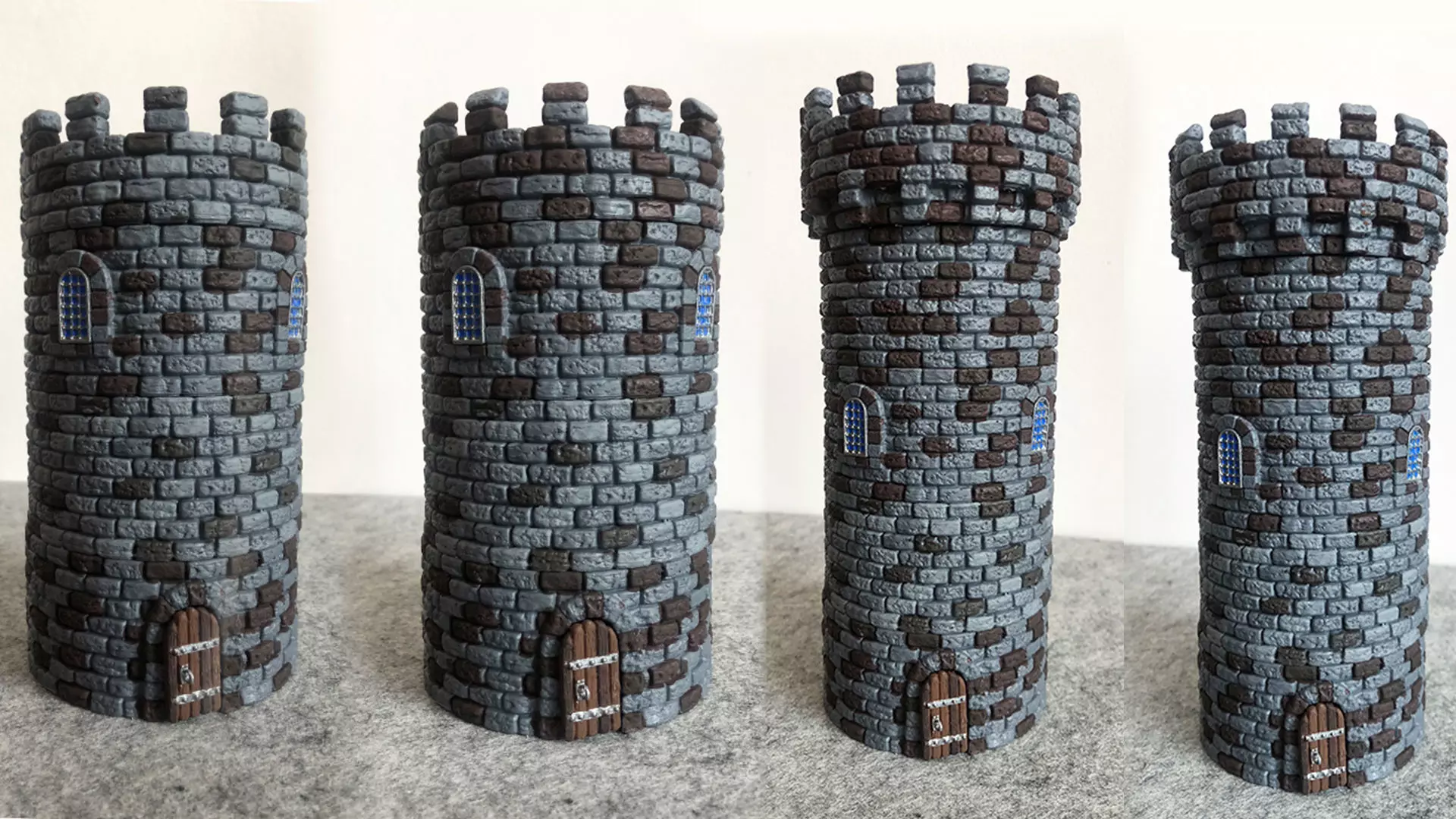 There were many types of towers in the Middle Ages, but one of the main ones was roundtowers. In this section are presented large towers, all modular pieces are made for the development of different options for building a castle. There is a model with 1 entrance or 4 ntrances, there is 1 window or 4 windows, there is also a mix of windows and doors. There are 4 towertops, 2 by the diameter of the towers and 2 with a ledge, loopholes also differ on the tops, there are oblique and square. Each piece has ledges for installing the floor, here are 5 stone and 4 wooden floors with different diameters, adapter from round towers to square towers or walls