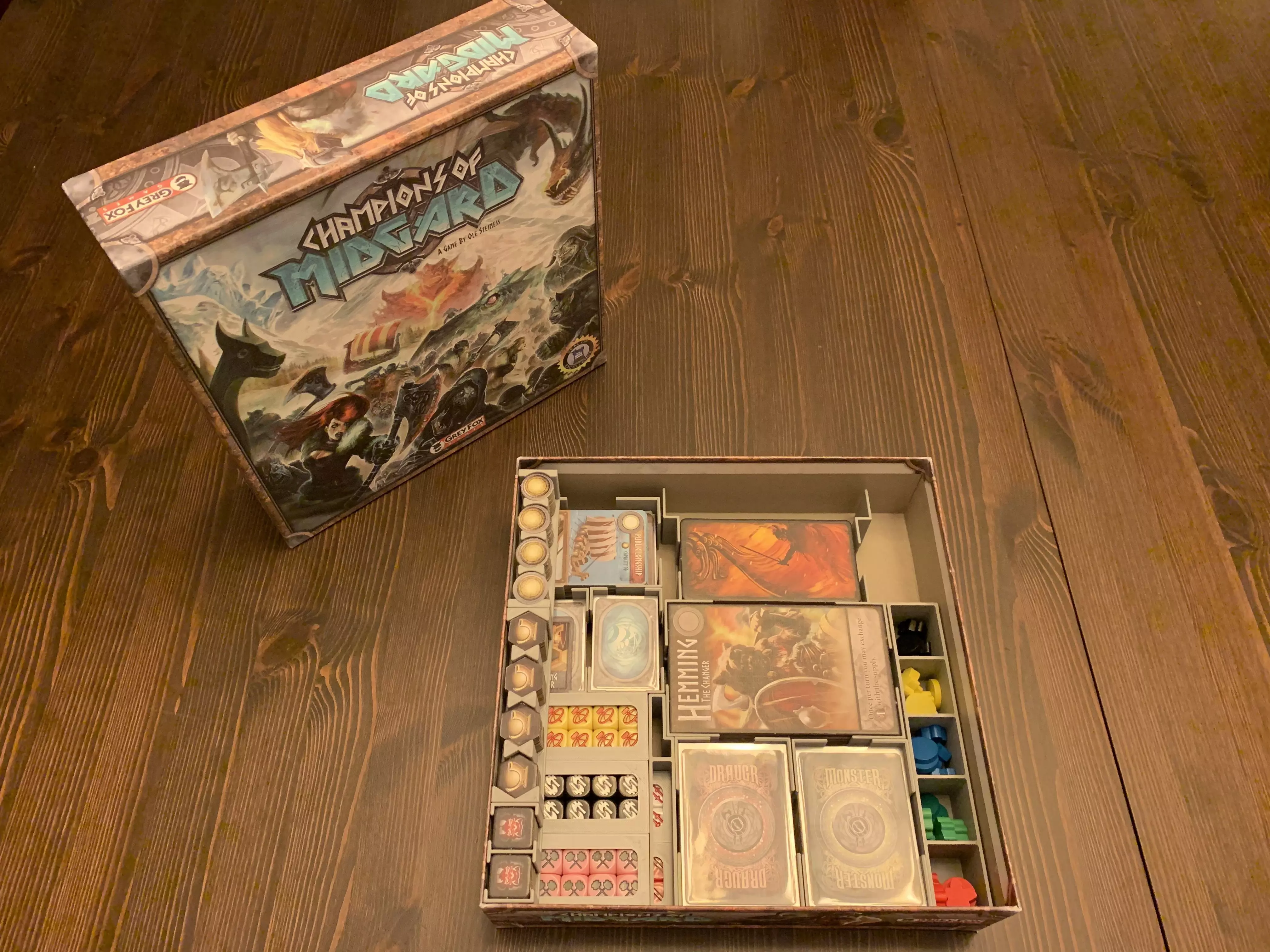 Organizer for the Champions of Midgard base game, Valhalla expansion, and a few bits from The Dark Mountains expansion. Designed to be stored upright in the retail (non-Kickstarter) box for the base game.