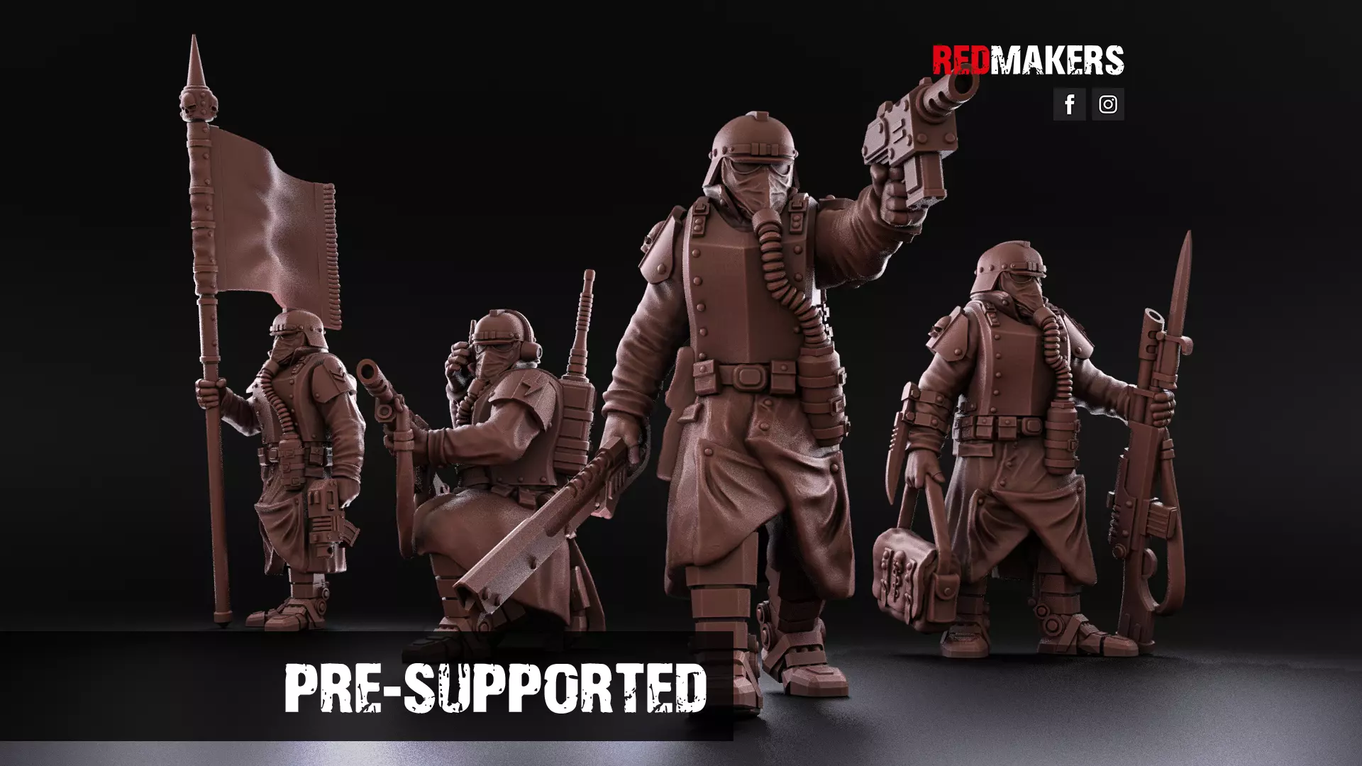 The squad consists of a Commander, a Medic, a Radio-operator and a Guardsman with Banner. Scaled for 28 mm tabletop.