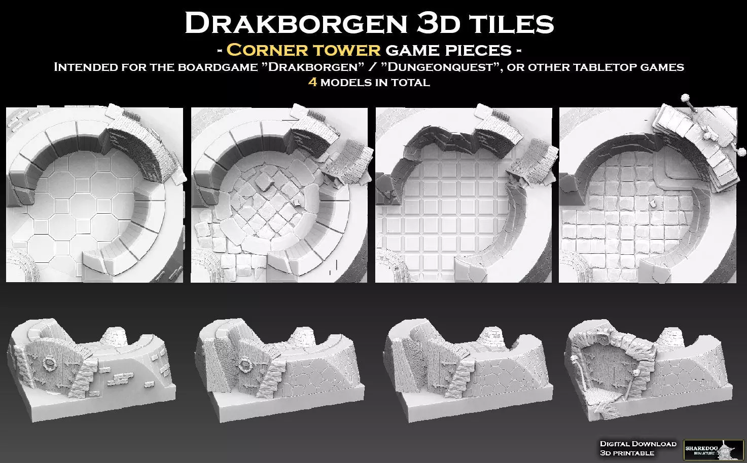 Drakborgen (known as Dungeonquest in English-speaking countries) is a Swedish boardgame published in 1985. In the game, your player characters navigate the innards of a dark fortress in search of the dragon's treasure. You explore the fortress by laying out room tiles on a game-board grid. The original tiles were flat 2D pieces of cardboard. The tiles in this model pack are an attempt to recreate 3D versions of the original tiles, mimicking their artwork.My ambition is to eventually publish a complete set of 3D tiles inspired by the boardgame (there are 116 tiles in the original version...). The corner tower tiles included in this model pack are a teaser release in the meantime. They correspond to the four possible start locations for players on the original game board -see images in the included gallery for further information.