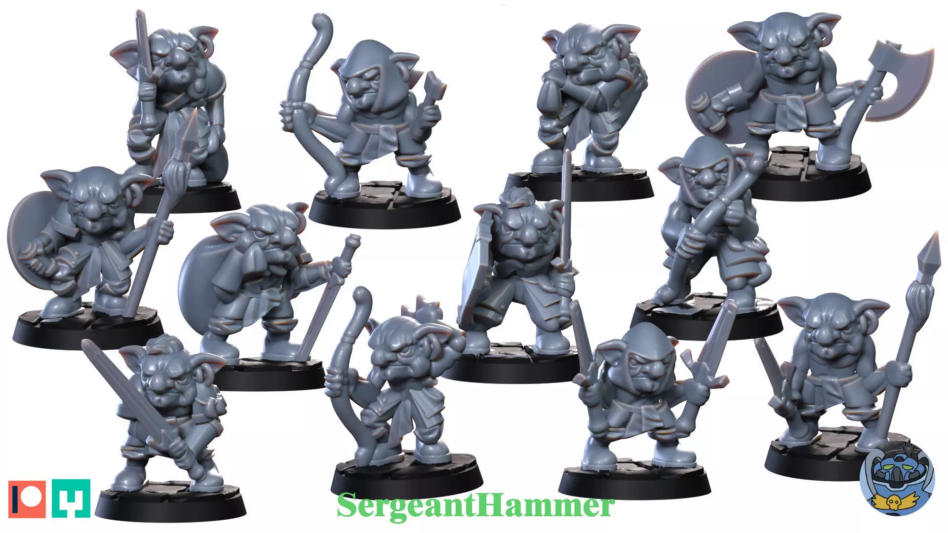 This set includes a large group of unique goblin characters, each sculpted with its own personality and equipment. Among them are spear-wielding fighters, sword-bearing warriors, shielded defenders, and nimble archers ready to strike from a distance. Their dynamic poses capture the unpredictable and energetic fighting style typical of goblin tribes.