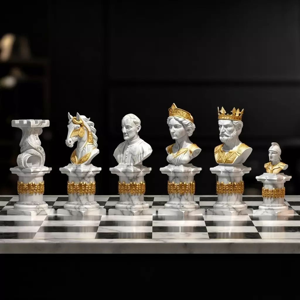 This artisan medieval chess set consists of six sculpted STL bust miniatures inspired by royal courts, feudal armies and classical European nobility. Each chess role is reimagined as a sculptural bust with traditional clothing, armor plating and ornamental medieval elements. The king and queen display a noble aristocratic atmosphere, while the knight and rook reflect military design language. The bishop carries a more scholarly and ecclesiastical inspiration, and the pawn embodies the appearance of a disciplined soldier.