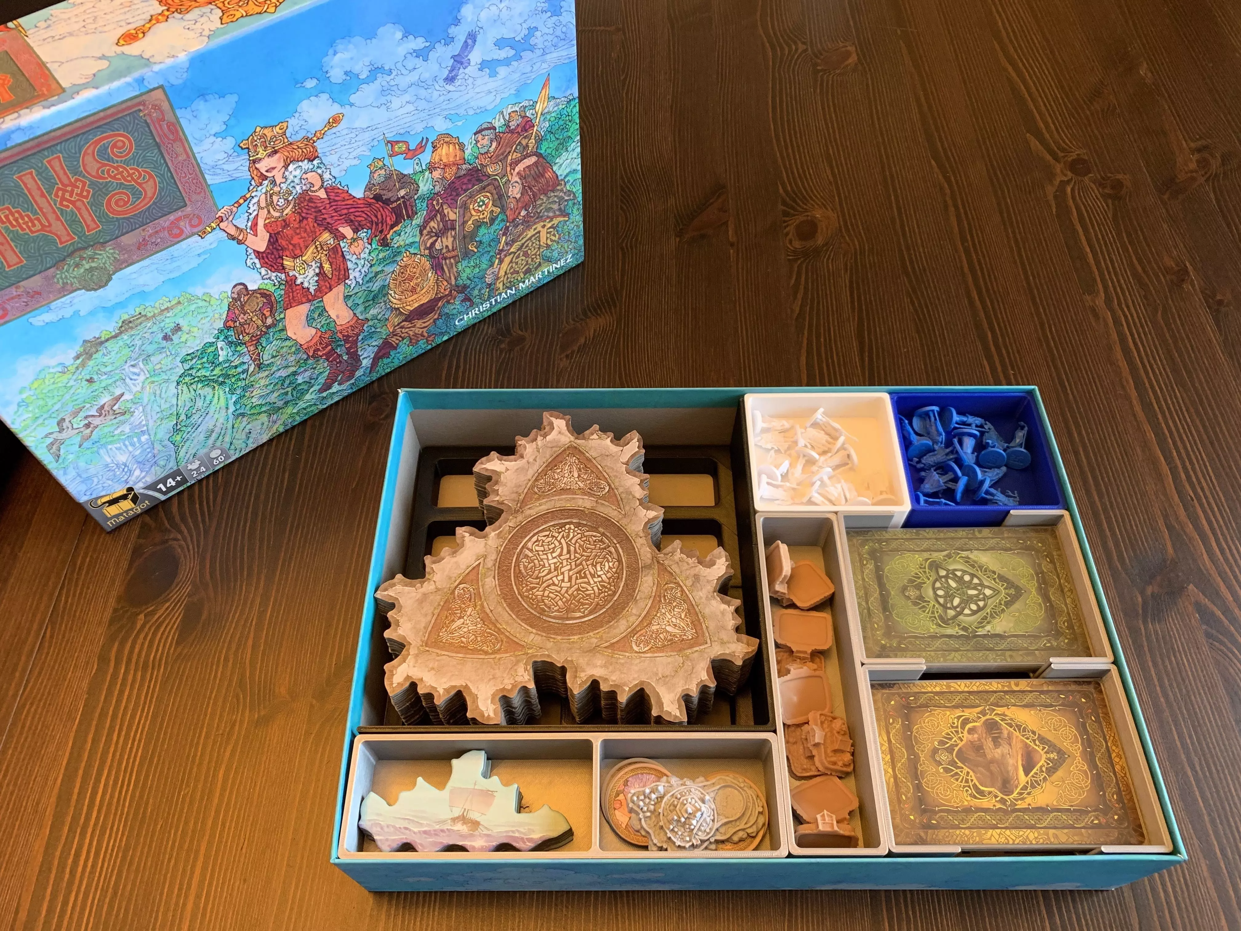 Organizer for Inis board game, including Seasons of Inis expansion, designed for upright storage and accomodating sleeved cards.