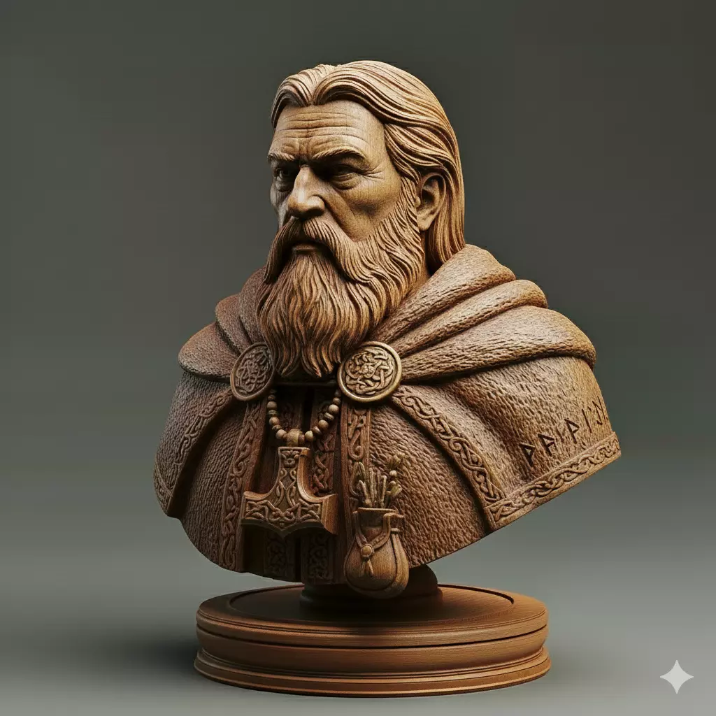 This Medieval Viking Spiritual Leader Chess Piece is a 3D printable bust featuring a wise Norse sage with a rugged, weathered face and a heavy, detailed beard. The piece is rich with symbolic details, including a Mjölnir pendant and a fur-lined cloak etched with ancient runes, giving it a powerful and mystical presence. It's an excellent choice for anyone looking to add a character of deep wisdom to their chessboard or to display as a unique art piece. The fine craftsmanship and realistic wood-carved texture make it a standout addition to any collection of Norse lore or custom chess sets
