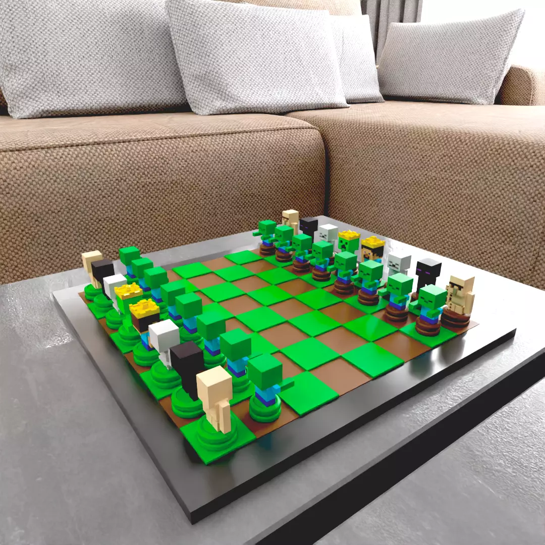 This 3D model set features a chessboard and pieces inspired by iconic mobs from Minecraft, perfect for fans looking to combine strategy and creativity.The set includes all standard chess pieces, each reimagined with the shapes of familiar mobs. It also allows you to let your imagination escape and add different functions or movements to each piece, such as explosive movements for the creeper queen or other ideas