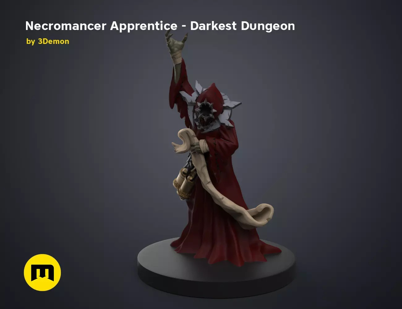 This is a digital 3D printable model of a Necromancer Apprentice figure for DnD or other role-playing tabletop games. The boss necromancer figure is inspired by the Darkest Dungeon videoame.