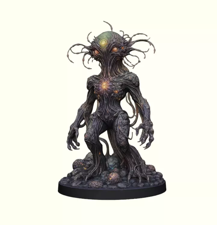 The character stands on a textured ground base that resembles clustered spores, stones, and bulbous growths. That base adds stability and provides extra paint opportunities for bioluminescent effects, wet organic highlights, or corrupted earth themes. The overall design suits tabletop monsters, sci-fi horror encounters, fantasy realms with cosmic corruption, or collector display shelves where an unusual silhouette stands out.
