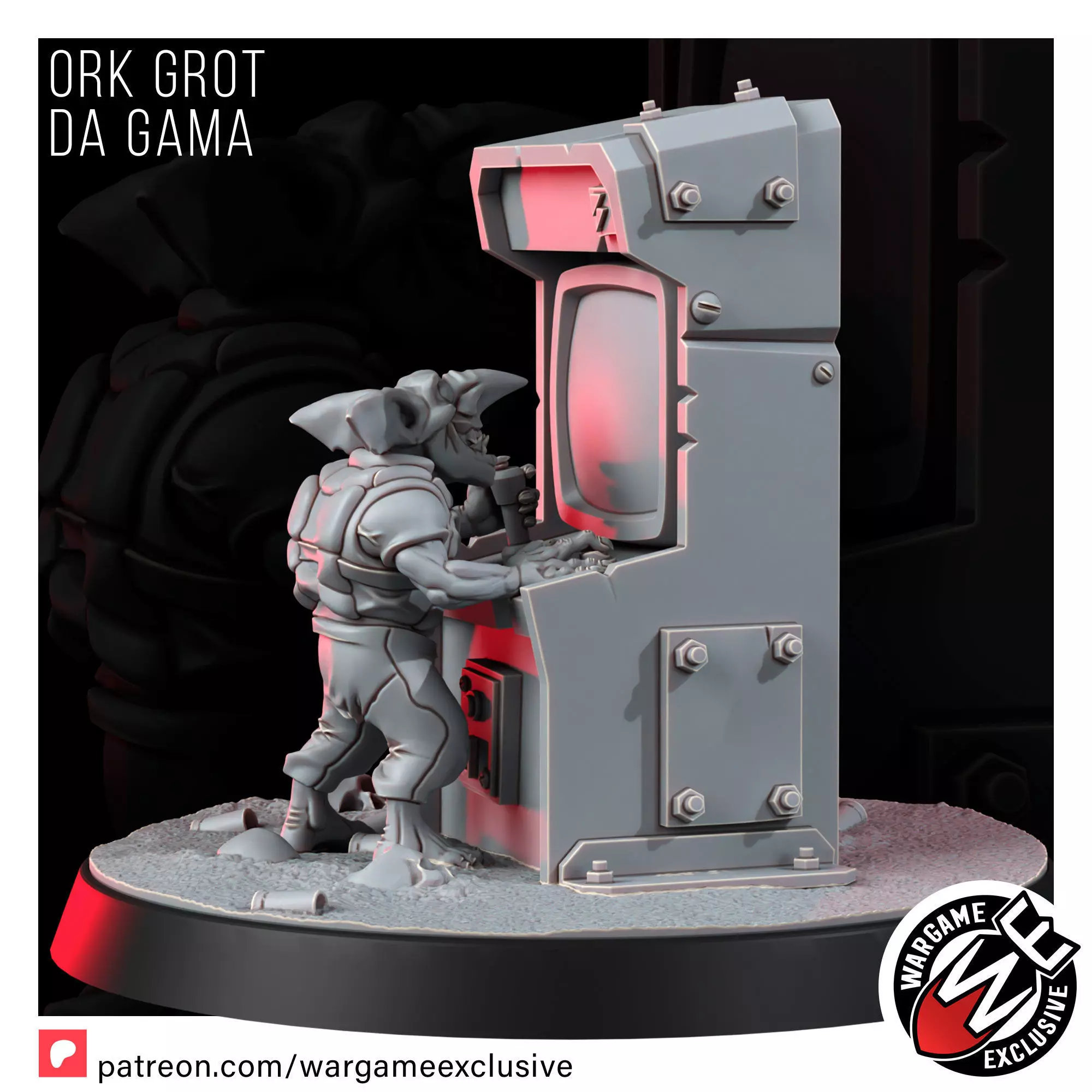 Meet ORK GROT DA GAMA - da only Grot in da galaxy who thinks going fast means button mashin' instead of krumpin.' Dressed in suspiciously retro offworld gear (we ain't askin' where he got that vest, but it's definitely not standard-issue), this lad's found da ultimate tech relic: a mysterious, glowin' beepin' box full of tiny ghosts and dots wot need eatin.'