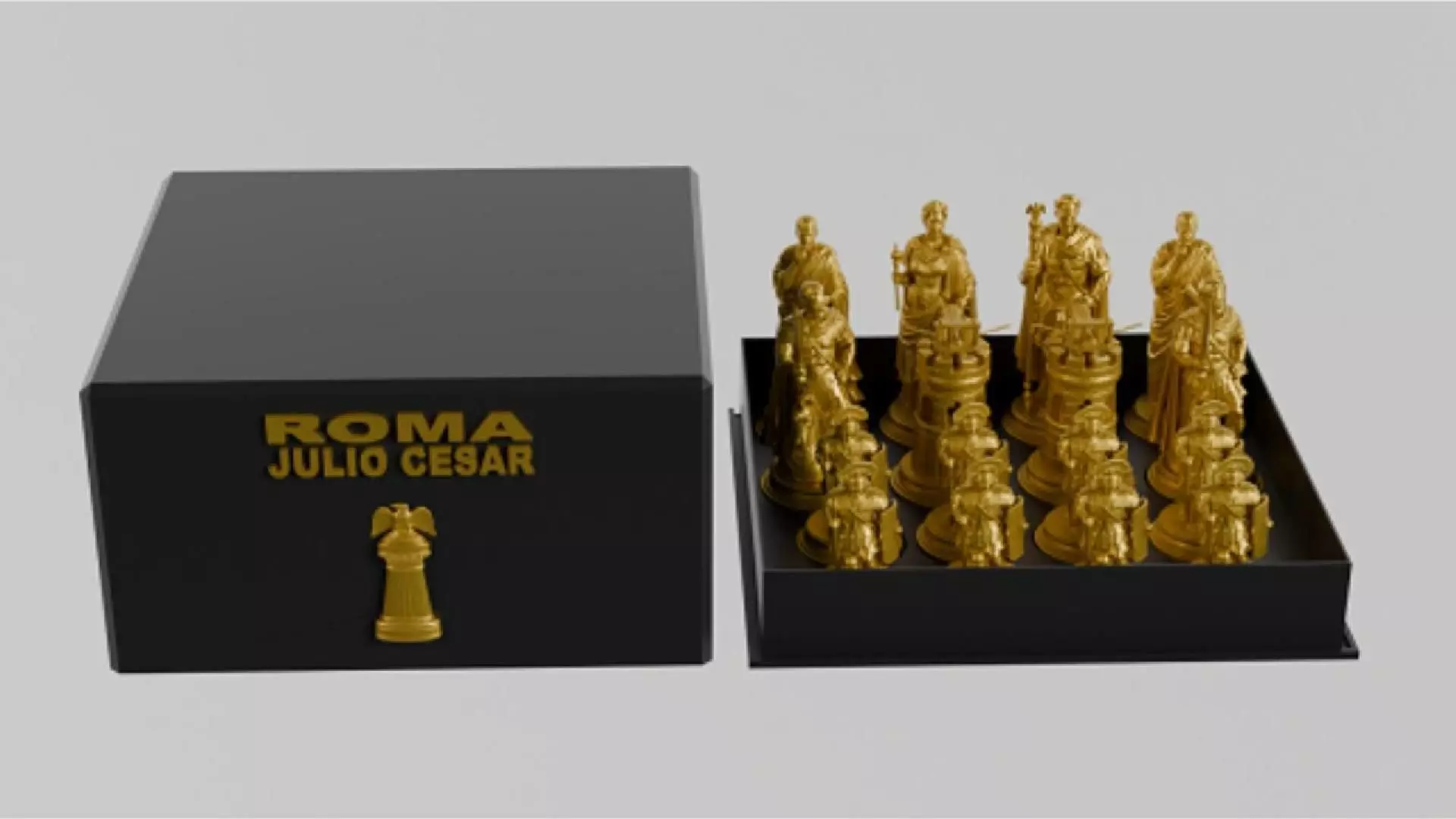 Set de ajedrez histórico inspirado en Roma y Julio César, compuesto por piezas imantadas de diseño exclusivo y una caja de almacenamiento y exhibición creada específicamente para este set.