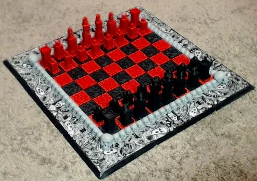 This includes all 3D Object .stl files as well as cam and fusion generated pictures for a full chess set including board frame, board tiles and player pieces. The full set includes the board and pieces. each file will need to be printed multiple times. It will take some time to print all the pieces so patience and time is important. The artwork around the skull frame in full board pictures is not included in these files and is not available. I printed everything at 100% infill for the weight and sound of the pieces being placed after moving. Please feel free to message me with any questions you may have. I have also included a file for plain tiles.