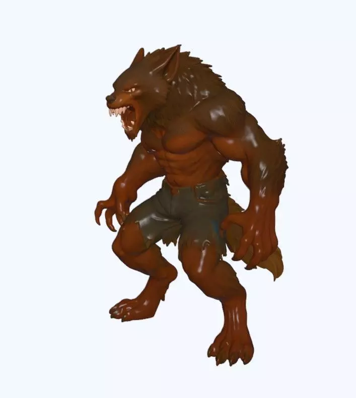 This 3D model represents a fierce werewolf mid-roar, captured in a powerful and upright stance. The creature blends humanoid muscular structure with feral lupine features, including an elongated snout, clawed hands and feet, pointed ears, and a thick fur mane across its shoulders. Tattered shorts hang loosely over its legs, emphasizing a transitional transformation from man to beast.