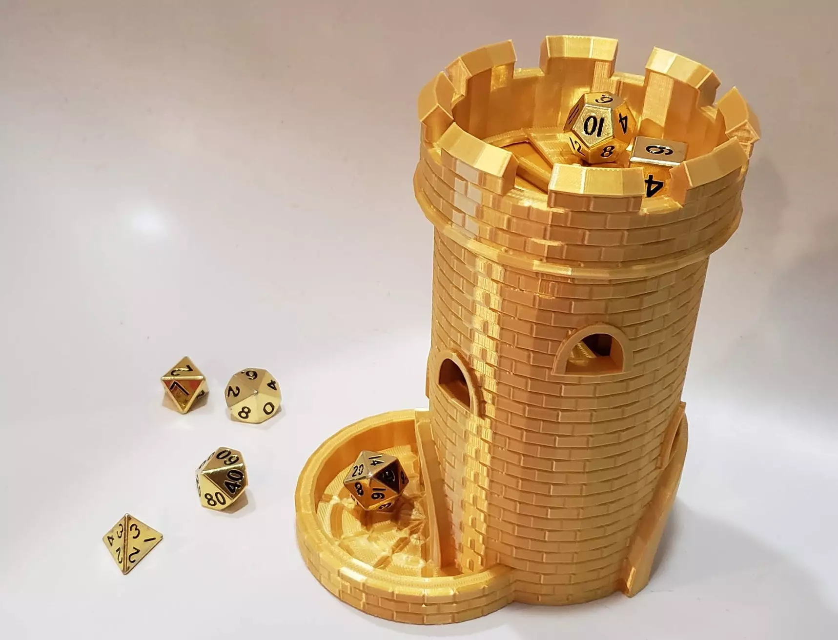 This is the perfect tower, whether you want to effectively randomize your beloved dice, or punish them for betraying you. One twist of this tower's top reveals a secret entrance to the dice jail: A prison where your mutinous die can suffer in isolation, watching all the other dice and miniature figurines play and have fun while it ponders what will happen the next time it lands on 1 for a death saving throw.