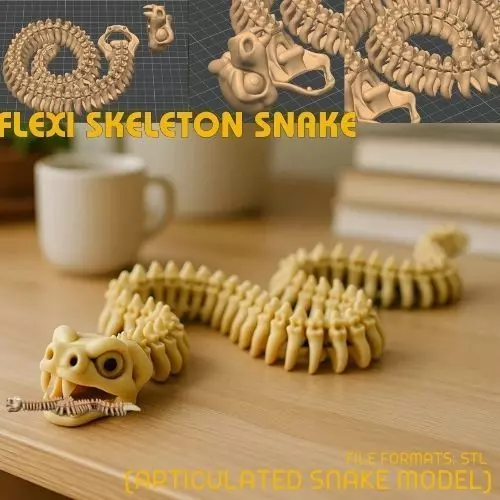 The Flexi Skeleton Snake is an articulated 3D print design that bends and moves thanks to its flexible joints. This decorative model requires no supports, making it beginner-friendly and easy to print. Compatible with standard FDM printers, it can be scaled to different sizes. Printed with PLA for ease and detail, or TPU for added flexibility, this snake makes a fun fidget toy, desk decoration, or simply a cool demonstration of articulated 3D printing.