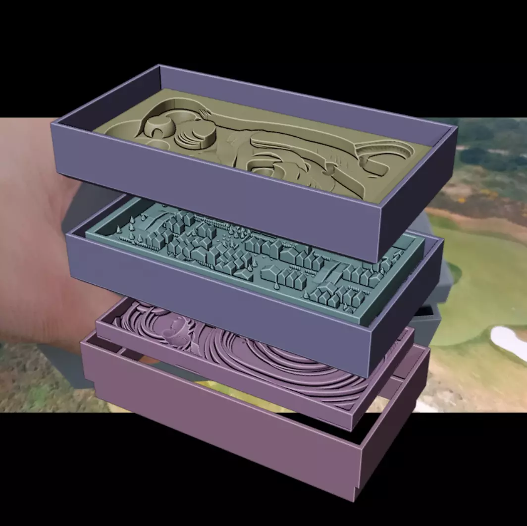 Stackable Infinite Mini-Golf Tower and Pocket Art Frame. This product can transform into 3 customizable items, allowing you to create unique combinations. It can be a decorative piece for your home: use the blocks to compose a minimalist and modern artwork. It can be a pocket golf course: print the box, print the blocks, and finally print a lid. The third feature is my favorite! It consists of a series of stackable levels that can be connected via the stackable lid (yes, the box lid can hold one level, but it can also contain a series of levels, transforming into an awesome infinite tower! The ball will fall to the level below, and you can keep playing continuously).