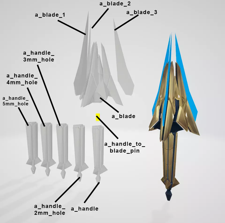 -Minimum required print area:180x180x180 mm (All basic printer and bambu lab a1 mini suitable)-There is a pin for each piece. It is not possible to install it incorrectly.-There are 5 different hole sizes available for attaching a chain to the handle piece. 2mm-3mm-4mm-5mm or nohole.-All parts are aligned ready for direct printing. There is also a model with all parts aligned. (full.stl)-I recommend painting it after assembling it.-The triangular sections were made hollow. The insides can be easily painted.-Detailed blender file available.